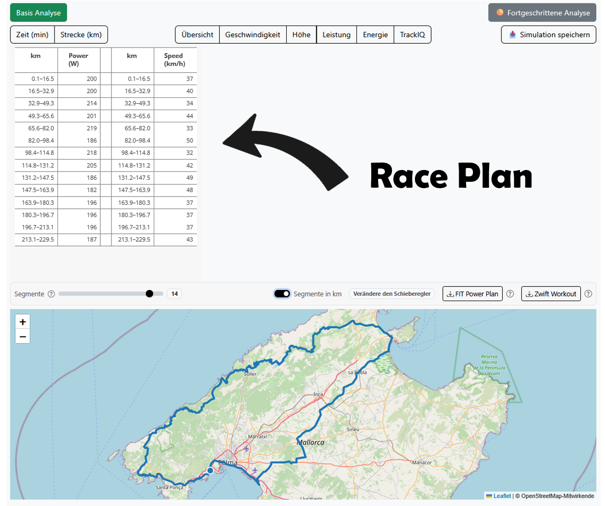 No more guesswork. You get a TrackIQ strategy: go faster through smarter distribution—at the same overall load (WP), tuned to the course, wind, and aero.
